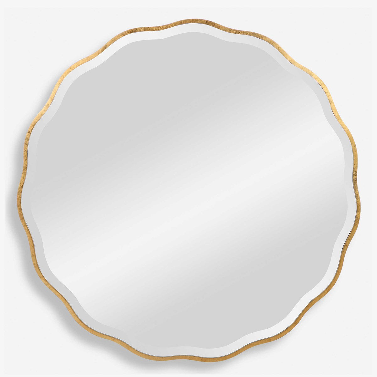 Showcasing a feminine scalloped edge, this shaped wood mirror adds whimsical flair to any design. The mirror is finished in aged gold and has a 1 1/4" bevel.