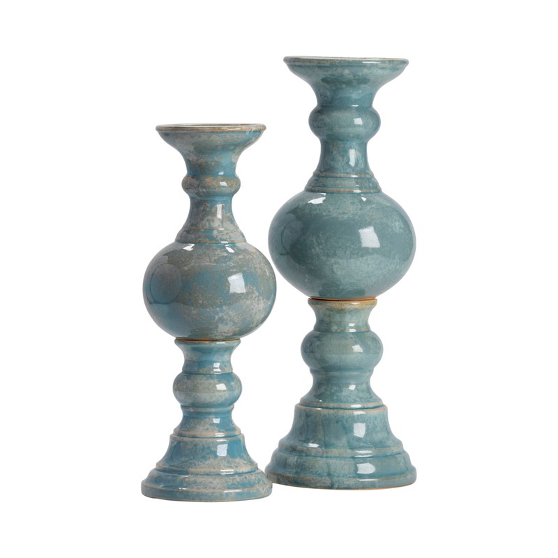 These candleholders are made from glazed ceramics. The glossy, light blue and ivory finish will attract the eye while the graceful, well-placed curves will guide your eyes from top to bottom. One candle holder is three-inches taller than the other, giving you a variety of decorating options -- beautifully incorporated in a centerpiece or on their own.