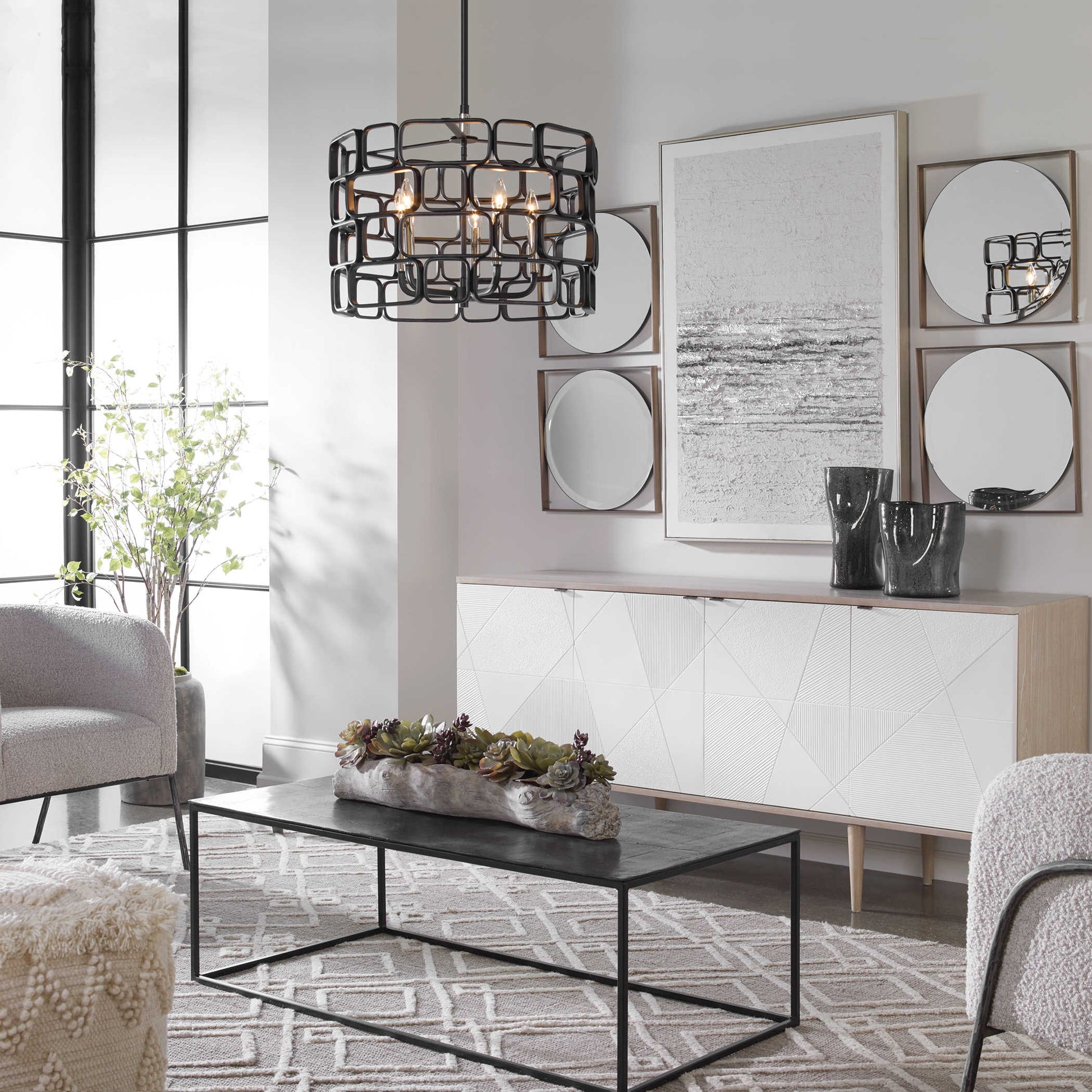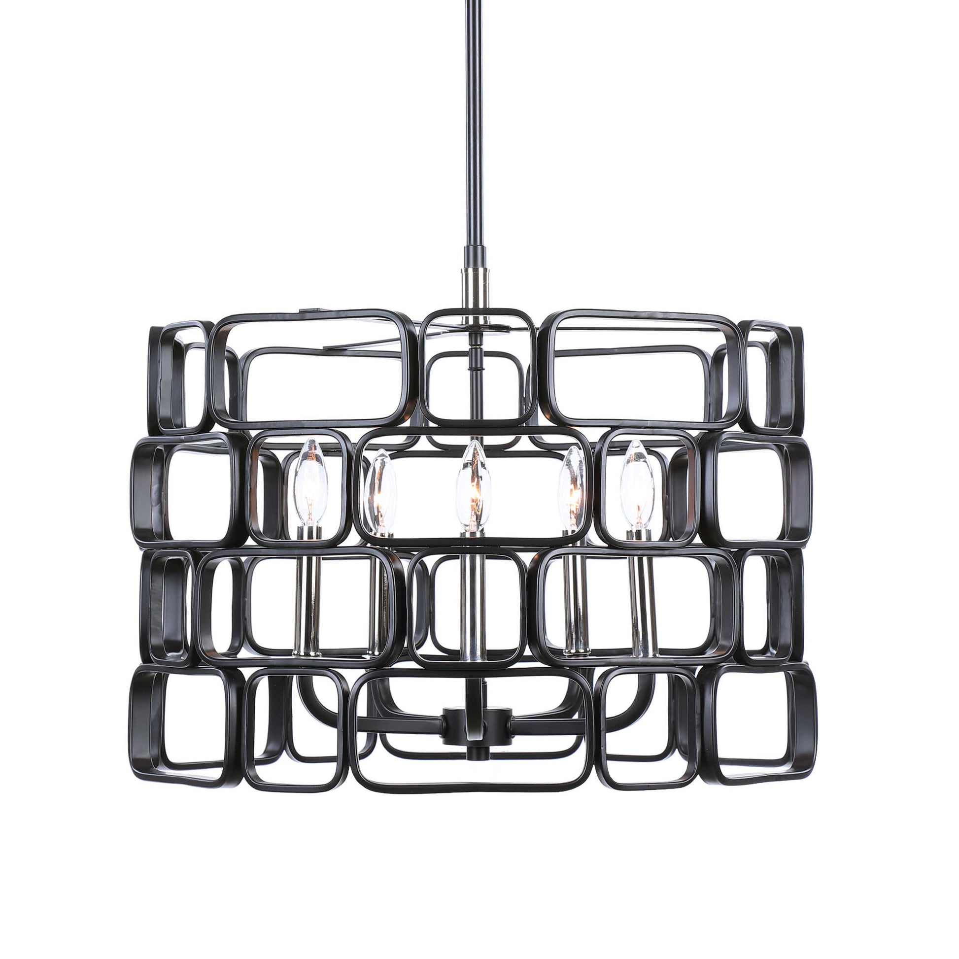 Stylish geometric squares and rectangles with gently rounded edges come together in a mosaic patterned outer shade finished in matte black with polished nickel accents completing this 5 Lt. pendant. With 5-60 watt max, candelabra sockets and includes 15' wire, 3-12" stems and 1-6" stem for adjustable installation.