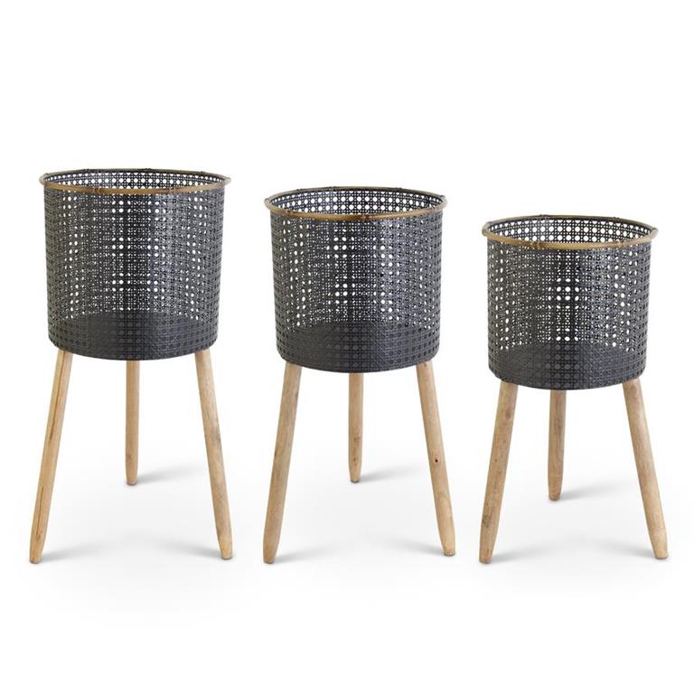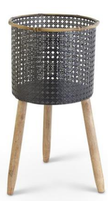 BLACK PUNCHED METAL CONTAINER W/WOOD LEGS