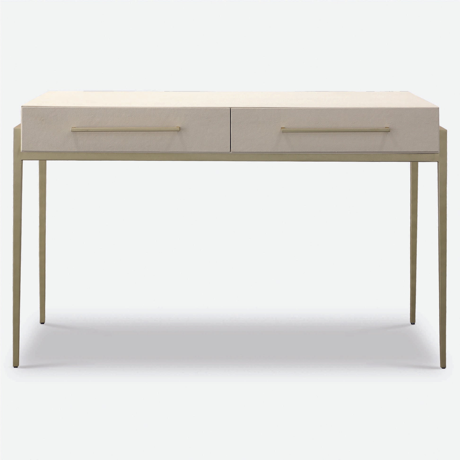 A modern and stylish place to catch up on emails, the Jewel desk features a white faux shagreen wrapped top nestled into an iron frame in gold leaf. The mitered edge drawer fronts and gold drawer pulls add to the sleek look.