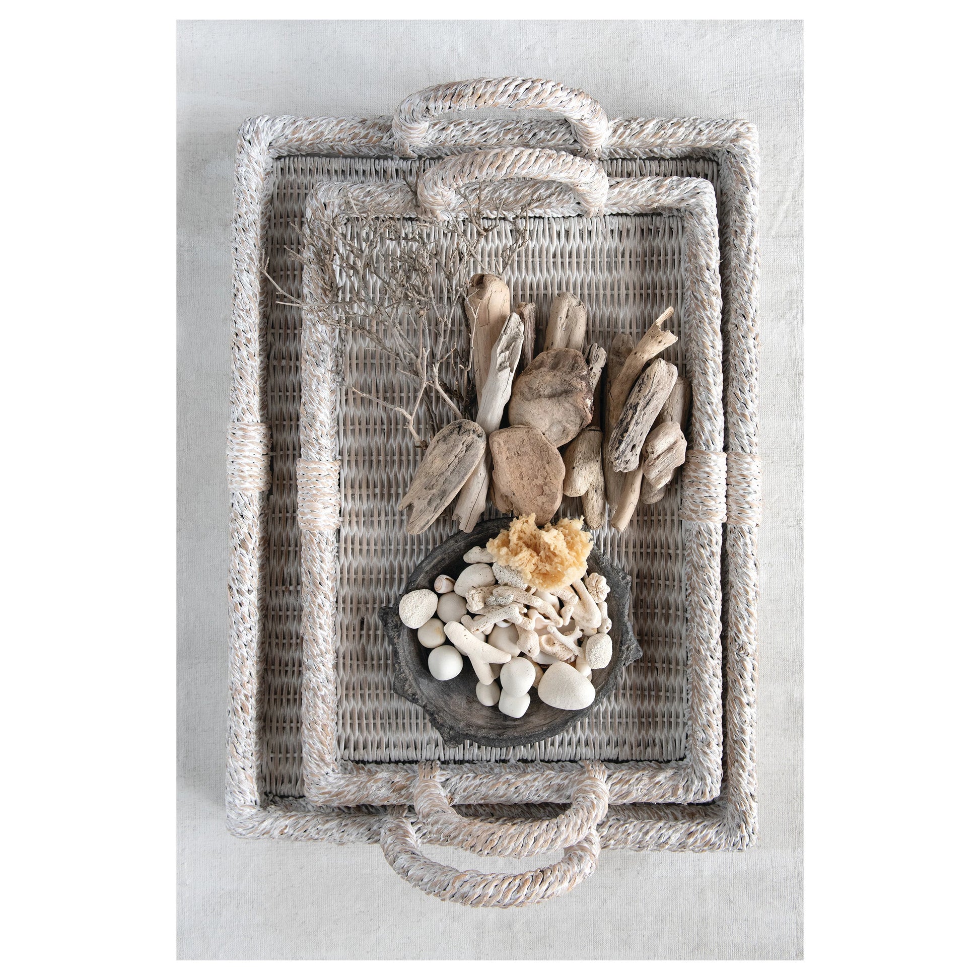 Make these rattan trays statement pieces in the living room and bedroom of your home. Fill one with dried botanicals and a selection of books to display on the coffee table or oversized ottoman. In the bedroom, place in the middle of the bed and display a decorative "breakfast tray" setting with small plate, cup and saucer and small vase with a single flower inside.