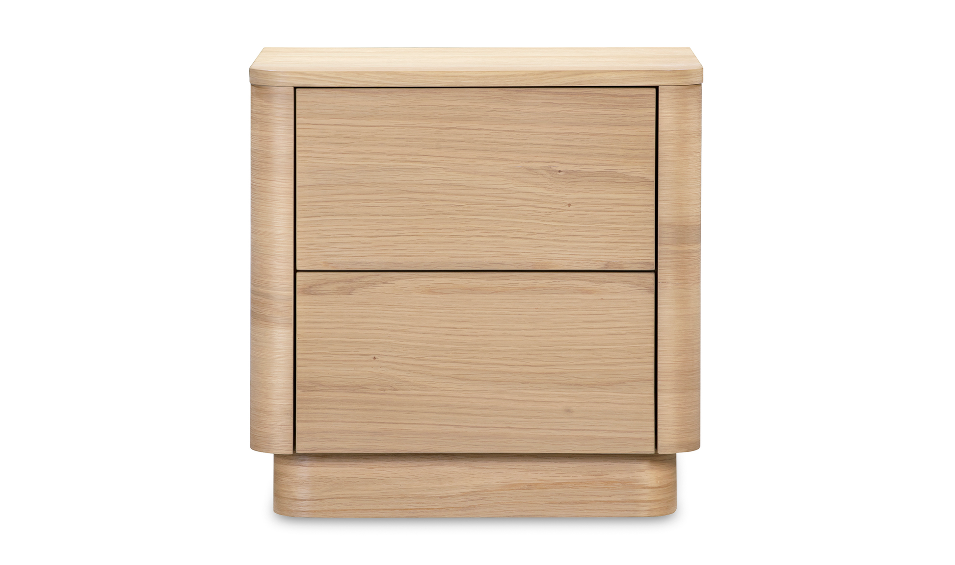 Natural allure meets minimalist design. The Round Of tall nightstand celebrates the captivating tones of natural wood grain, seamlessly integrated into a soothing design, embracing natural beauty and character. This tall nightstand boasts gently rounded corners and two large, smoothly gliding drawers that reveal generous storage space while embracing oak's natural beauty and character.
