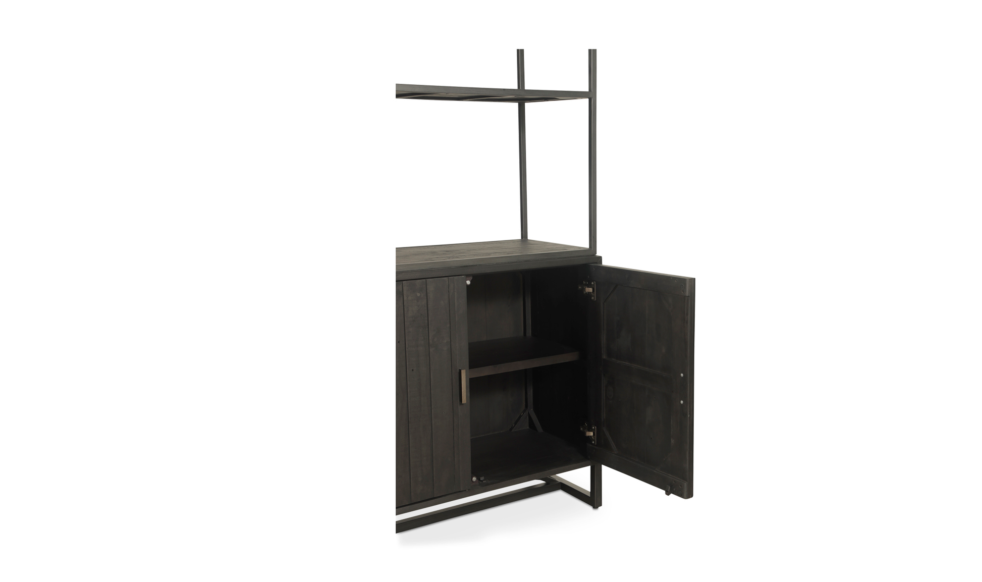 The Sierra Bookshelf's versatile design keeps things organized with different shelving units that allow for various items to be stored. Metal detailing against the solid reclaimed pine wood creates an industrial contrast.
