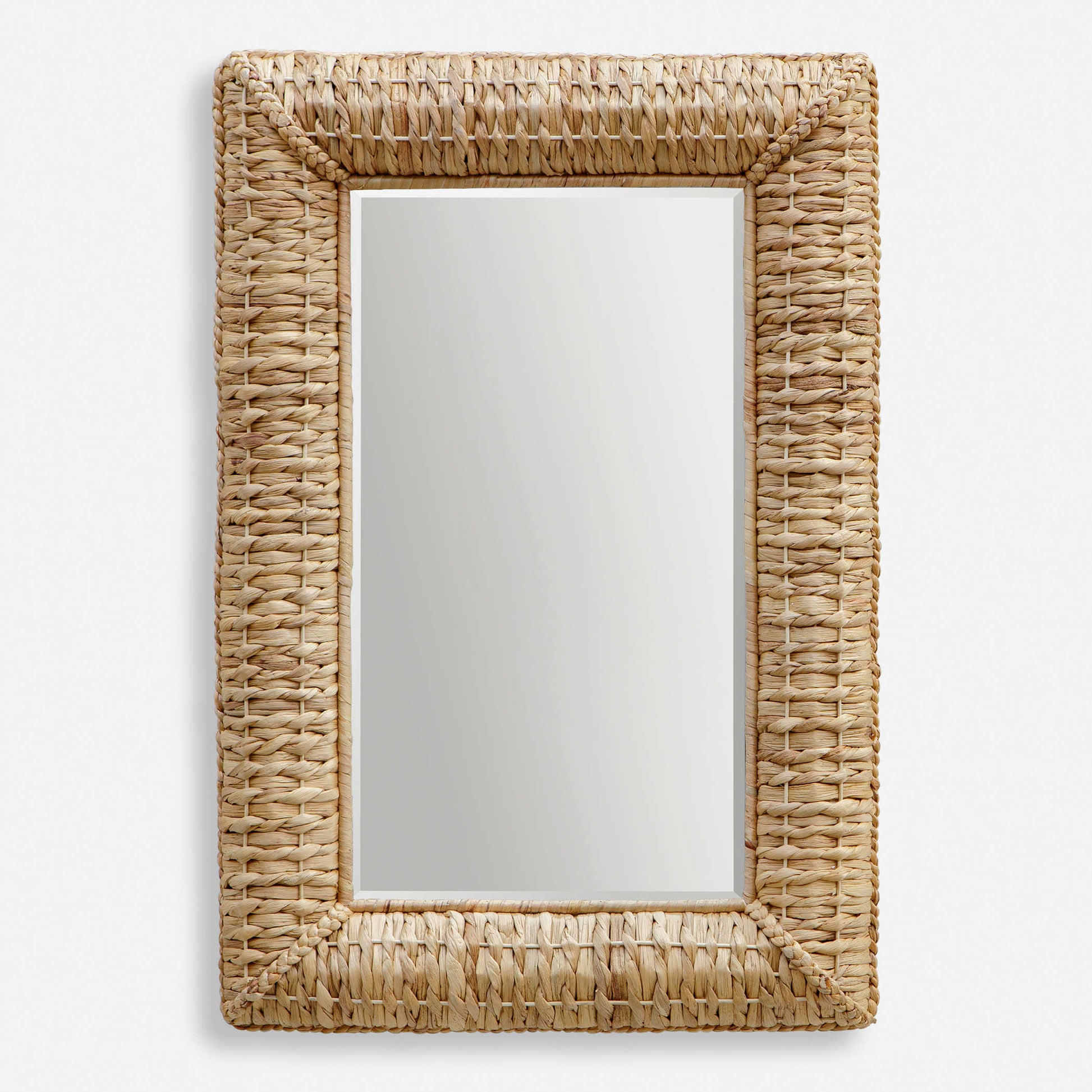 This rectangle mirror has a great coastal vibe by using alternating twisted natural seagrass over a rounded frame accented with matching tightly twisted edge banding. Mirror has a generous 1 1/4" bevel.