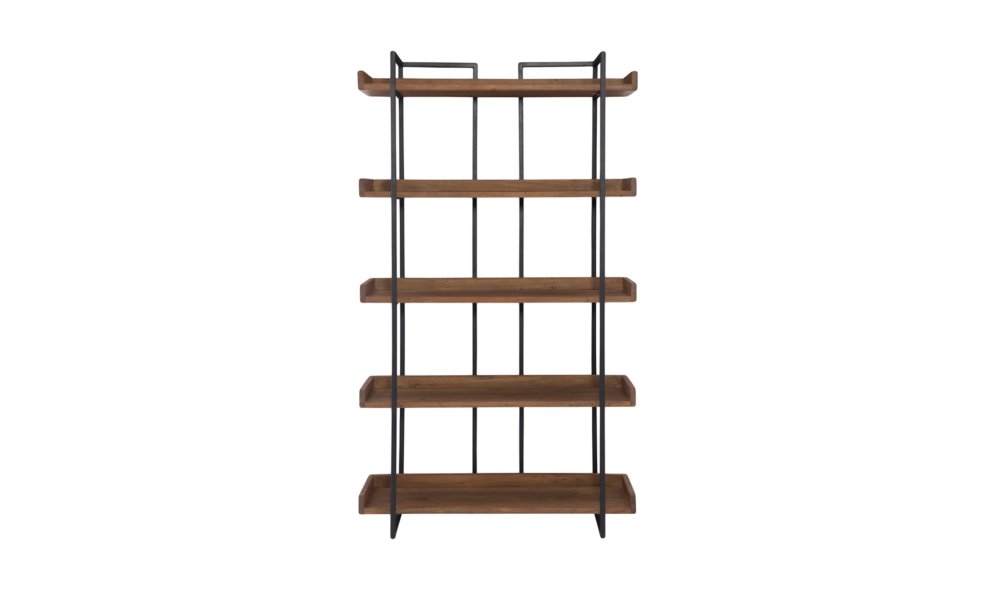 A sleek contemporary style constructed with an iron frame and solid acacia with a light brown stain.