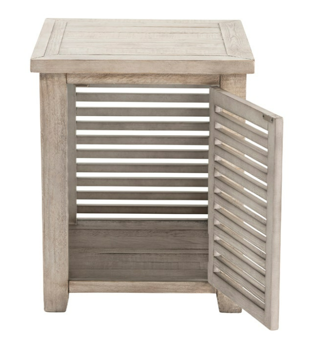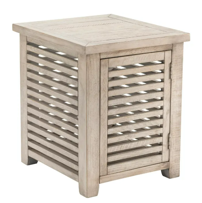 This White Bear Lake End Table graces the end of your chair or sofa with its warm cream pine wood finish and breezy coastal style. This table is a perfect spot for your glass, and a book or two while you relax for a bit. It's easy to store necessities like pillows or miscellany down below, behind a slatted door that lets light peek through.